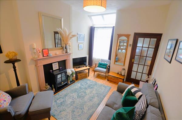 uPVC double glazed window to front aspect. Exposed wooden floorboards. Decorative fireplace with tiled hearth and wood fire surround. Boxed in gas and electric meters. Radiator. Coving to ceiling and ceiling light fitting.