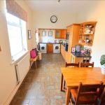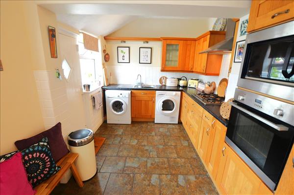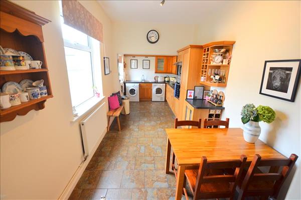 uPVC double glazed window to side aspect. Composite double glazed door to side aspect giving access to the yard. Tiled floor. Radiator. Fitted wall and base units with working surfaces incorporating a 1.5 stainless steel sink and drainer inset with mixer tap. Plumbing for washing machine. Tiled splashbacks. 5 Ring gas hob with extractor hood above. Eye level single oven. Under stairs storage. Ceiling light fittings.