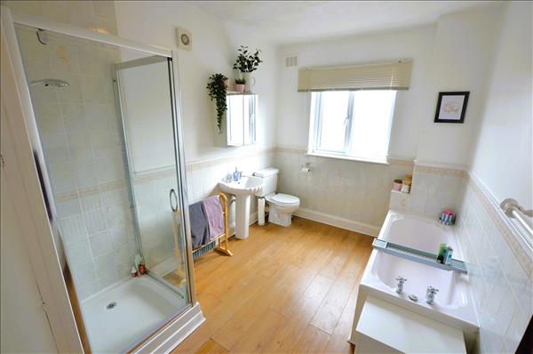 uPVC double glazed window to rear elevation. Wood effect laminate flooring. Radiator. Suite comprising of low-level WC, wash hand basin, bath and separate shower cubicle with thermostatic shower. Airing cupboard housing BAXI combination gas central heating boiler. Tiled splashbacks. Extractor fan. Ceiling light fitting.