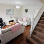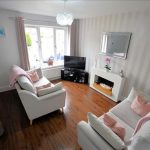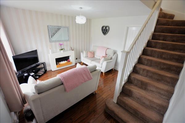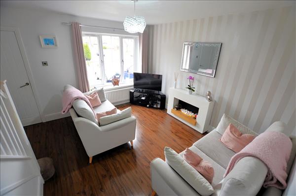 Upvc double glazed window to front, laminate wood effect flooring, decorative fireplace, radiator, smoke alarm and ceiling light fitting.