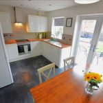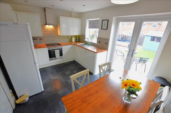 Features a range of wall / base units with contrasting worktops. Includes built in under counter single oven with electric hob & extractor above, tiled splash backs, integrated washer, stainless steel sink with mixer tap, space for tall fridge/freezer, useful under stairs store cupboard, radiator, laminate tile effect flooring, spotlights and ceiling light fitting. Upvc double glazed window to rear, Upvc double glazed french doors to rear. Also houses gas central heating boiler.