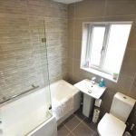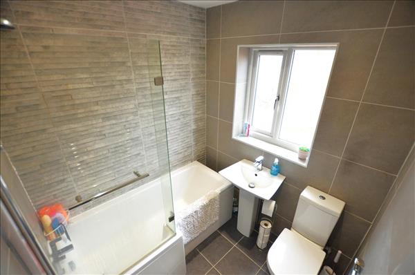 Suite comprising of low level w.c, wash hand basin with mixer tap and P-shaped bath with mixer tap / electric shower over. Finished with tile to floor, tiled walls, chrome towel radiator, extractor fan and spotlights to ceiling. Upvc double glazed window to side.