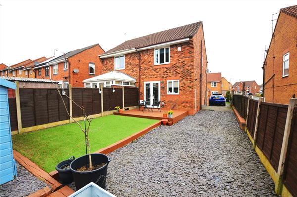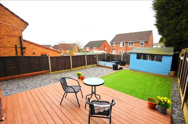 Paved drive to front with lawn garden. Double iron gates to side provide access through to the rear.To the rear is a wooden decked patio extending onto sections of artificial grass and decorative plum slate with further decked patio and garden shed located to far rear.