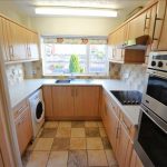 Upvc double glazed window to front, range of wall / base units with contrasting roll edge worktops, built in eye level double oven, electric hob with extractor hood above, tiled splash backs, stainless steel sink with mixer tap, tile to floor, built in cupboard (also housing hot water cylinder), space for tall fridge/freezer, plumbing for washing machine and ceiling light fitting.