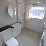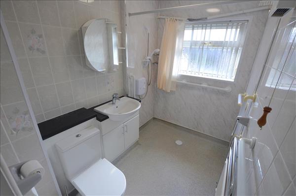 Suite comprising of low level w.c, wash hand basin with mixer tap / built under vanity unit and electric shower. Finished with vinyl flooring, tiled walls with the addition of shower boarding, towel radiator, extractor and ceiling light fitting. Upvc double glazed window to side.