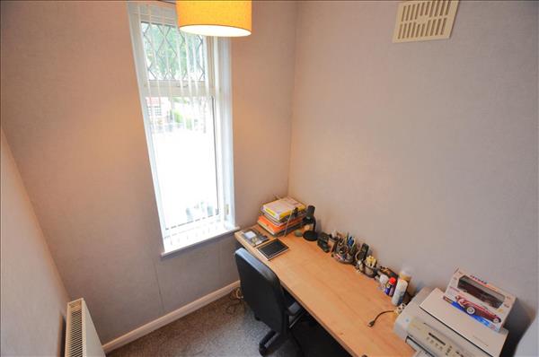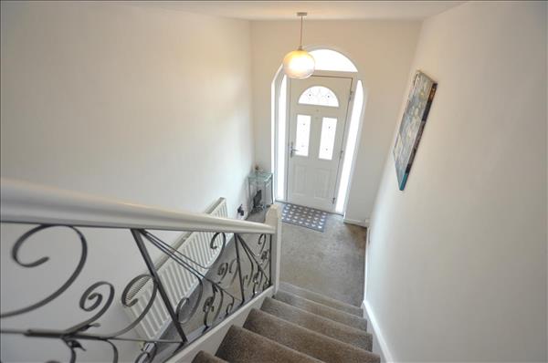 Composite double glazed door to front, carpet to floor, radiator, under stairs store (also housing gas central heating boiler) and ceiling light fitting. Stairs off to first floor.