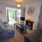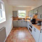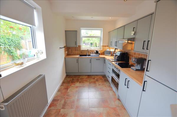 Features a range of wall / base units with contrasting worktops. Includes built in under counter double oven, electric hob with extractor above, tiled splash backs, 1.5 sink with mixer tap, integrated tall fridge/freezer, integrated dishwasher, tile to floor, radiator and spotlights to ceiling. Upvc double glazed door to side, Upvc double glazed windows to side & rear.