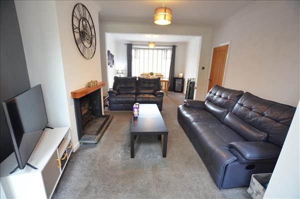 Carpet to floor, feature log burner, radiator, coving and ceiling light fitting.