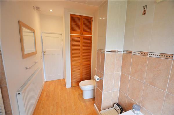 Suite comprising of low level w.c, wash hand basin, panelled bath and walk in enclosure with electric shower over. Finished with laminate wood effect flooring, part tiled walls, built in airing cupboard with hot water cylinder, extractor fan and spotlights to ceiling. Upvc double glazed window to rear.