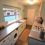 Features a range of wall / base units with contrasting roll edge worktops. Includes built in under counter single oven, four ring gas hob, tiled splash backs, stainless steel sink with mixer tap, space / plumbing for washing machine / dryer, radiator, tile to floor and ceiling light fitting. Upvc double glazed window to side. Door through to: