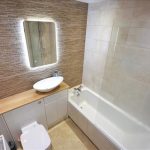 Suite comprising of low level w.c, wash hand basin with built under vanity unit / worktop and panelled bath with mixer tap & feature rainfall shower over. Finished with luxury vinyl tile effect flooring, tiled walls, extractor fan, radiator, wall mounted l.e.d mirror and spotlights to ceiling. Upvc double glazed window to side.