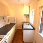 Range of wall / base units with contrasting worktops. Includes free standing cooker, washing machine, fridge & freezer, stainless steel sink with mixer tap, tiled splash backs, laminate wood effect flooring and ceiling light fitting. Upvc double glazed window to side. Part glazed wooden door to side provides access to exterior.
