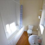 Suite comprising of low level w.c, wash hand basin and shower enclosure. Finished with laminate wood effect flooring, extractor fan and spotlights to ceiling.