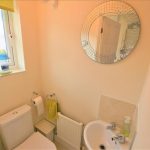 White suite comprising of low level w.c, wash hand basin and panelled bath with mixer tap / shower attachement over. Finished with tiled splash backs, vinyl to floor, radiator and ceiling light fitting. Upvc double glazed window to side.