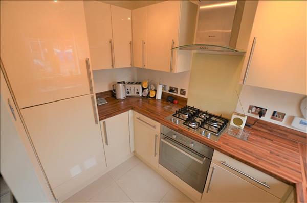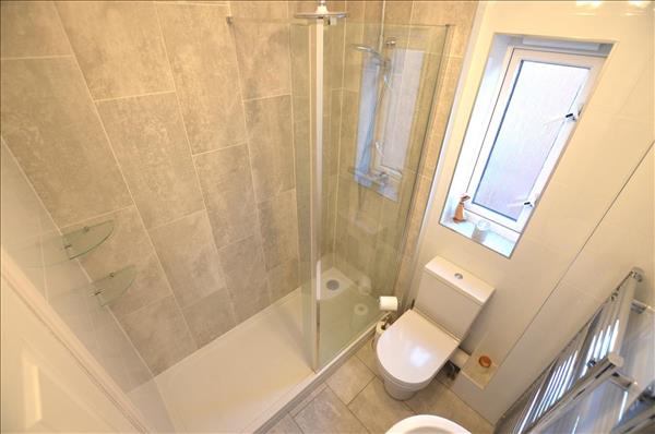 Features a range of wall / base units with contrasting roll edge work tops. Includes stainless steel sink with mixer tap, integrated tall fridge/freezer, built in single oven with four ring electric hob & extractor above, tile to floor (with underfloor electric heating), space / plumbing for washing machine and ceiling light fitting. Also houses boxed combination gas central heating boiler. Upvc double glazed window to front.