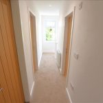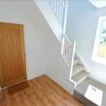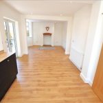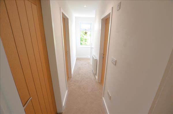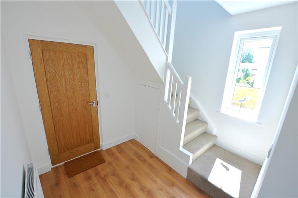Solid Wood door to front, Upvc double glazed window to side, laminate wood flooring, radiator, mains smoke alarm and spotlights to ceiling. Stairs off to first floor. Door off to:
