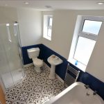 Low level w.c and wash hand basin. Finished with tile to floor, radiator, extractor fan and spotlights to ceiling.