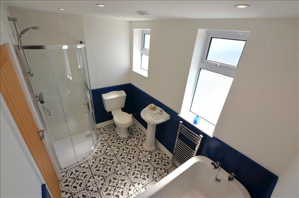 Suite comprising of low level w.c, wash hand basin, free standing roll top bath and quadrant enclosure with mixer shower over. Finished with tile to floor, tiled splash backs, chrome towel radiator, extractor fan and spotlights to ceiling. Upvc double glazed windows to rear.