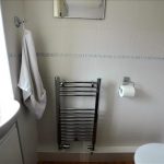 Low level w.c, wash hand basin with mixer tap / built under vanity unit, chrome towel radiator, tiled walls, vinyl to floor and ceiling light fitting.