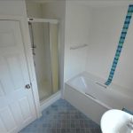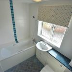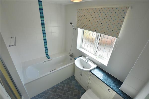 Suite comprising of low level w.c, wash hand basin with mixer tap / built under vanity unit, panelled bath with mixer tap and separate cubicle with shower over. Finished with vinyl to floor, tiled walls, radiator and ceiling light fitting. Upvc double glazed window to front.