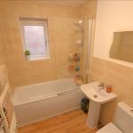 Suite comprising of low level w.c, wash hand basin with mixer tap and panelled bath with mixer tap / shower attachment over. Finished with vinyl to floor, towel radiator, part tiled walls, extractor fan and ceiling light fitting. Upvc double glazed window to side.