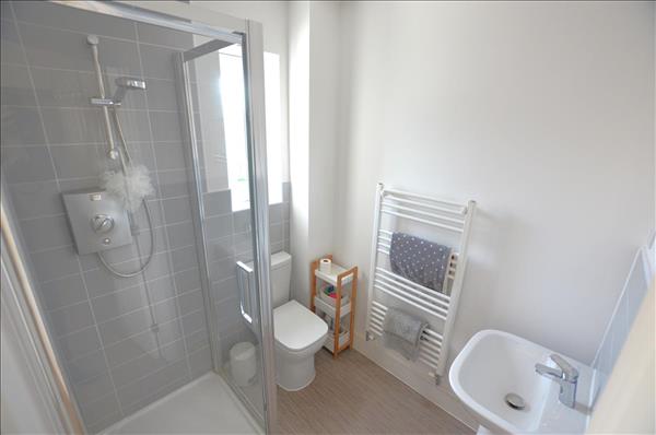 Suite comprising of low level w.c, wash hand basin with mixer tap and enclosure with electric shower over. Finished with vinyl to floor, towel radiator, part tiled walls, extractor fan and ceiling light fitting. Upvc double glazed window to front.