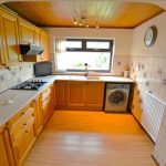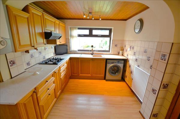 Features a range of wall / base units with contrasting roll edge worktops. Includes built in eye level single oven, four ring gas hob with extractor above, part tiled walls, single bowl sink with mixer tap, space for tall fridge/freezer, space/plumbing for washing machine, laminate and carpet to floor, radiator, wall mounted combination gas central heating boiler and ceiling light fitting. Upvc double glazed window to rear, Upvc double glazed door to side (providing access to exterior / driveway). Open arch from kitchen through to: