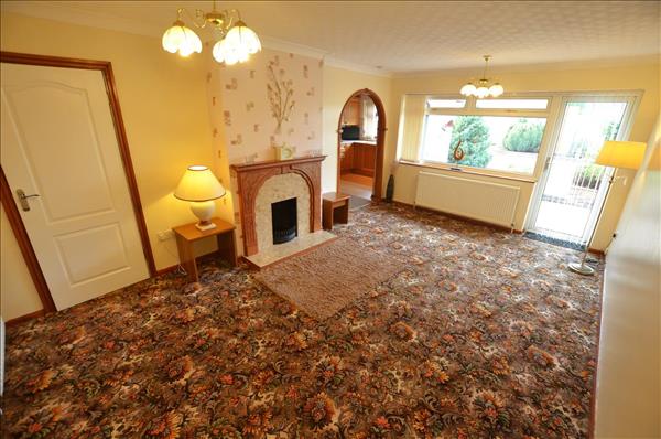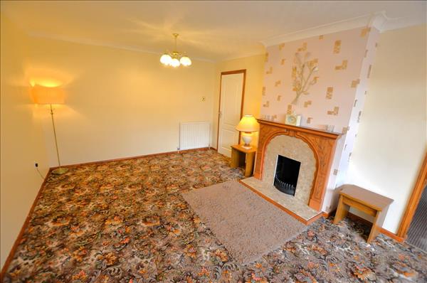 Upvc double glazed door and window to rear, carpet to floor, radiators, decorative fireplace, coving and ceiling light fittings.