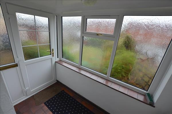 Double glazed door to front, tile to floor, built in store. Part glazed door through to conservatory. Door off to: