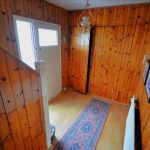 Wooden part glazed door to front, wood flooring, built in store, radiator and ceiling light fitting. Stairs off to first floor.
