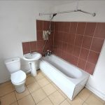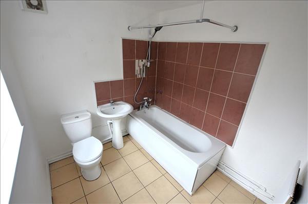 Suite comprising of low level w.c, wash hand basin with mixer tap and panelled bath with mixer tap / shower over. Finished with tile to floor, tiled splash backs, extractor fan, radiator and ceiling light fitting. Wooden double glazed window to side.
