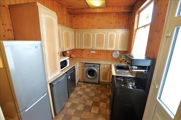 Features a range of wall / base units with roll edge worktops. Includes stainless steel sink with mixer tap, space/plumbing for washing machine, space for further appliances, tile to floor, boxed gas central heating boiler and ceiling light fitting. Upvc double glazed door & window to side. Door off to: