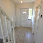 Upvc double glazed door to front, laminate wood effect flooring, under stairs store, thermostat heating control, radiator and ceiling light fitting. Stairs off to first floor.