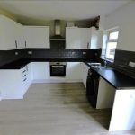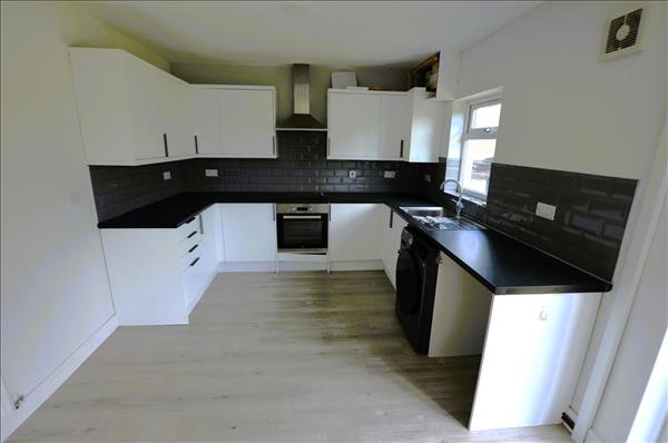 Features a range of wall / base units with contrasting roll edge worktops. Includes built in under counter single oven with electric hob & extractor above, tiled splash backs, stainless steel sink with mixer tap, space / plumbing for washing machine, space for further appliances, built in store housing combination gas central heating boiler, laminate wood effect flooring throughout, radiator, boxed electric meter and spotlights to ceiling. Upvc double glazed french doors to rear, Upvc double glazed window to rear.
