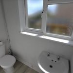 Suite comprising of low level w.c and corner wash hand basin. Finished with laminate wood effect flooring and spotlight to ceiling. Upvc double glazed window to side.
