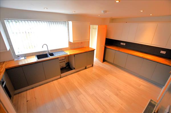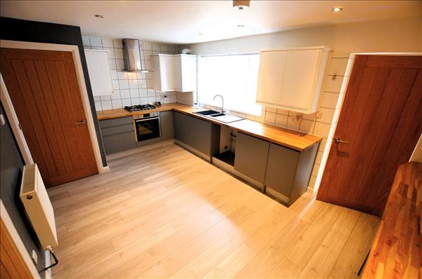 Features a range of wall / base units with contrasting worktops. Includes built in single oven with four ring gas hob & extractor above, tiled splash backs, integrated dishwasher, integrated tall fridge/freezer, space/plumbing for washing machine and 1.5 sink with mixer tap. Finished with laminate wood effect flooring throughout, useful built in pantry, boxed combination gas central heating boiler, additional under stairs store and spotlights to ceiling. Upvc double glazed window to rear.