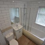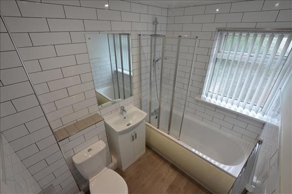 Suite comprising of low level w.c, wash hand basin with mixer tap / built under vanity unit and panelled bath with mixer tap / shower over. Finished with vinyl to floor, chrome towel radiator, part tiled walls and spotlights to ceiling. Upvc double glazed window to rear.