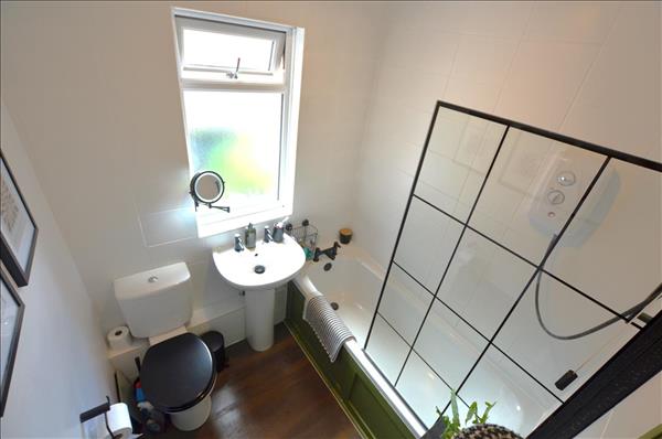 White suite comprising of low level w.c, wash hand basin and panelled bath with mixer tap & shower over. Finished with part tiled walls, laminate wood effect flooring, radiator and spot light to ceiling. Upvc double glazed window to side.