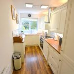 Features a range of wall / base units with contrasting roll edge worktops. Includes built in single oven, electric touch control hob with extractor above, tiled splash backs, integrated; washer & tall fridge/freezer, 1.5 ceramic sink with mixer tap, electric heater, laminate wood effect flooring and ceiling light fitting. Upvc double glazed window to front.