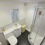 Suite comprising of low level w.c, wash hand basin with mixer tap / built under vanity unit and quadrant enclosure with electric shower over. Finished with laminate flooring, chrome towel radiator, extractor and spotlights to ceiling.