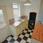 UPVC double glazed window to side, part glazed back door, wall and base units with worktop, stainless steel sink with mixer tap, light, tiled floor, radiator and step upto the utility.