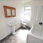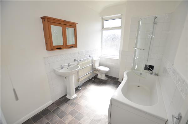 UPVC double glazed window to rear, p-shaped bath with shower attachment over, w.c, basin, light, radiator, vinyl flooring and part tiled walls.