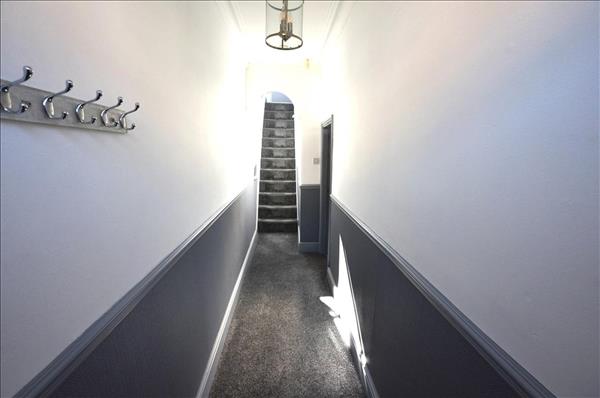 Main front door, carpet to floor, smoke alarm, coving and ceiling light fitting. Stairs off to first floor.