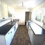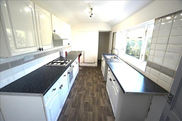 Features a range of wall / base units with contrasting roll edge work top, stainless sink with mixer tap, built in single oven with four ring gas hob & extractor hood above, plumbing for washing machine, space for tall fridge/freezer, radiator, vinyl to floor and ceiling light fitting. Wood double glazed window to side. Doorway through to: