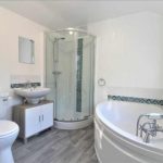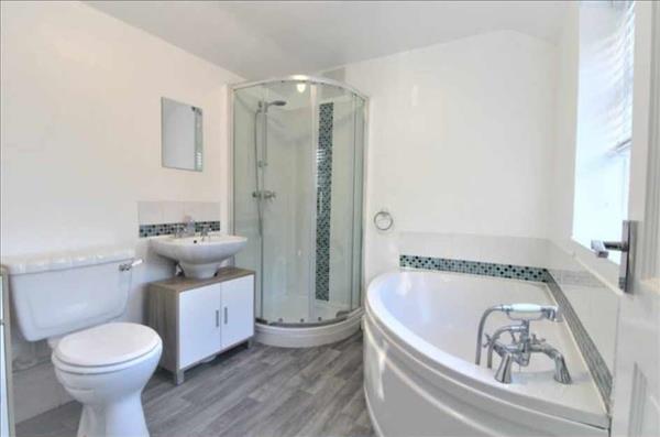 White suite comprising of low level w.c, wash hand basin, corner bath with mixer tap and separate shower cubicle. Finished with vinyl to floor, radiator, tiled splash backs and ceiling light fitting. Wood double glazed window to side.