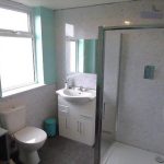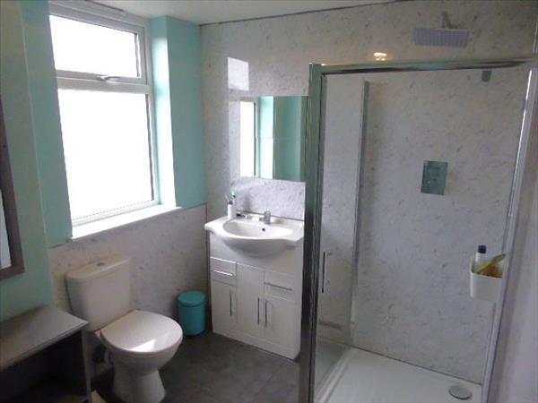 Suite comprising of low level w.c, wash hand basin with built under vanity unit and good size cubicle with rainfall mixer shower over. Finished with tile to floor, easy to clean shower boarding to wall, chrome towel radiator, extractor fan and ceiling light fitting. Upvc double glazed window to rear.