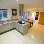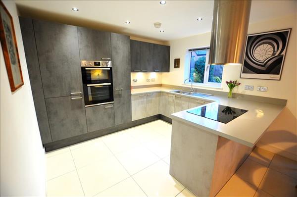 Feature open plan area including a range of wall / base units with modern worktop. Offering built in appliances including fridge/freezer, eye level double oven, induction hob with island extractor fan and integrated dishwasher. Other features include a 1.5 stainless steel sink with mixer tap, tile flooring throughout, radiator, spotlights and ceiling light fitting. Upvc double glazed french doors to rear, Upvc double glazed window to rear.