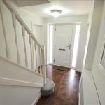 Composite entrance door to front, wood effect flooring, radiator and ceiling light fitting. Stairs off to first floor.