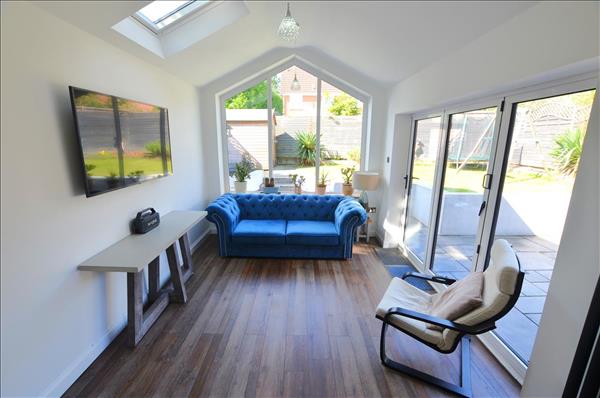 Feature Upvc apex window to rear, bi fold doors to side, vaulted ceiling, vertical radiator and ceiling light fittings.