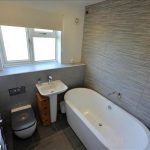 Suite comprising of low level w.c, wash hand basin with mixer tap and free standing bath with mixer tap over. Finished with tile to floor, part tiled walls, chrome towel radiator, extractor fan and spotlights to ceiling. Upvc double glazed window to rear.